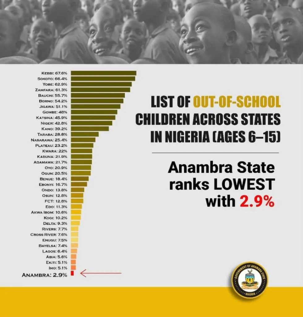 Anambra has emerged as a beacon of educational achievement in Nigeria, boasting the nation’s lowest rate of out-of-school children aged 6-15. This remarkable accomplishment, with a score of just 2.9%, stands in stark contrast to some states facing rates as high as 67.6%.